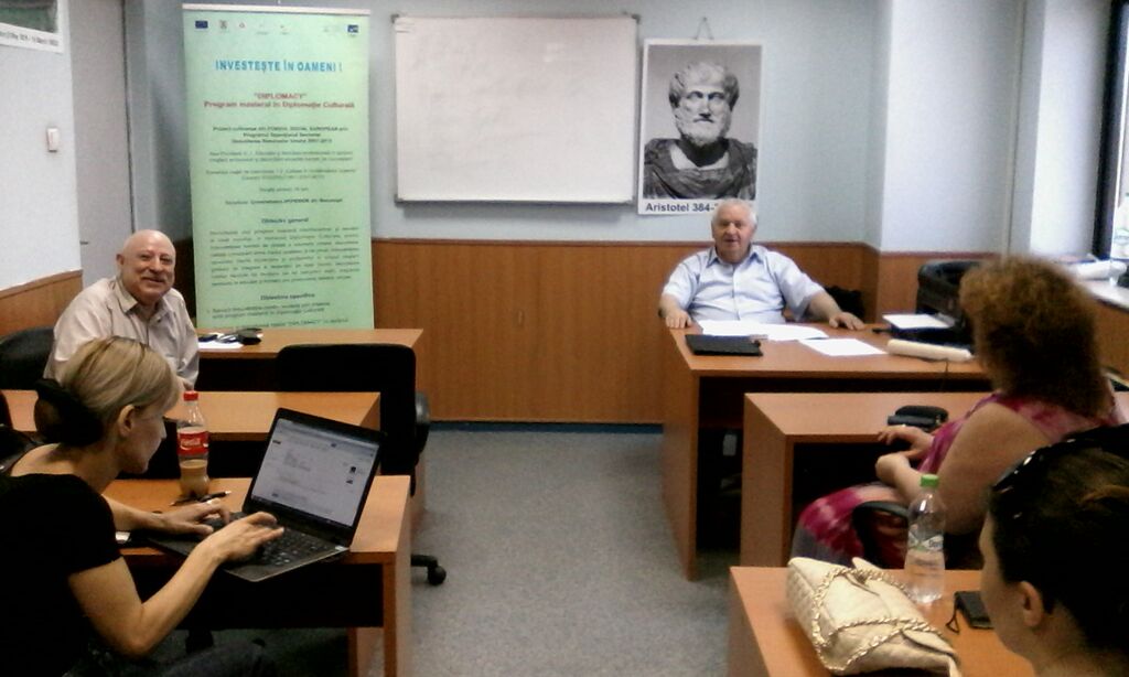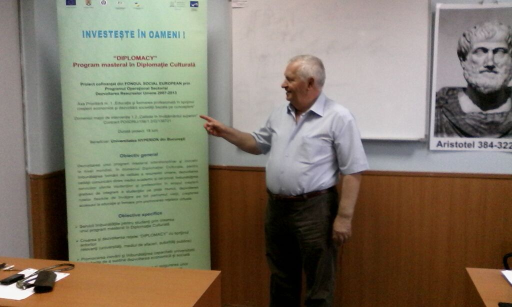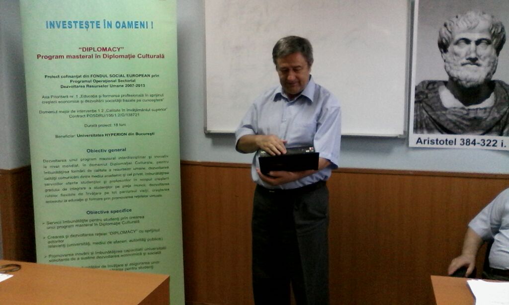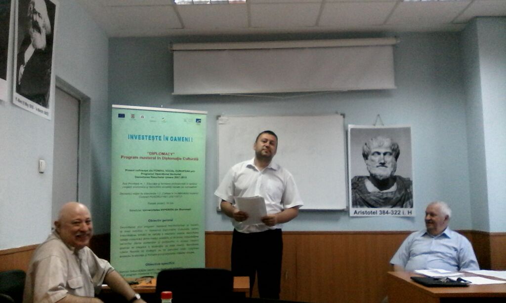 În cadrul proiectului proiectului “DIPLOMACY” – Program masteral în Diplomație Culturală, proiect cofinanţat din Fondul Social European prin Programul Operaţional Sectorial Dezvoltarea Resurselor Umane 2007 – 2013, Domeniul major de intervenție 1.2 „Calitate în învăţământul superior”, a fost organizată în data de 10.05.2015, între orele 16,00-18,00, sala 2.5, corp B, etaj 2, Universitatea Hyperion din București, Calea Călărașilor nr. 169, sector 3, București, Masa Rotundă cu tema Cadrul conceptual și organizatoric privind constituirea Rețelei, Centrului de documentare Diplomacy și pregătirea Grupului Țintă 2