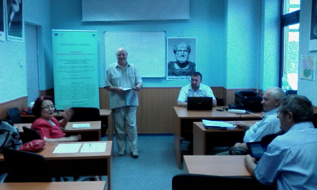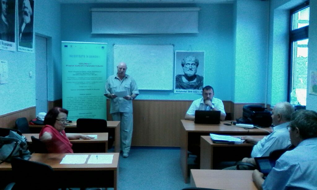 Domnul prof.univ.dr. Oșca Alexandru, în calitate de ETL, la punctul patru al Mesei Rotunde a susținut o intervenție cu titlul Concluzii privind activitatea de pilotare și analiza instrumentelor de testare în care a arătat că proiectul Diplomacy defineşte această activitate ca fiind una dintre cele mai importante; din acest motiv, managementul proiectului, echipa de implementare, experţii titulari de module şi cursanţii s-au mobilizat pentru atingerea scopurilor fixate.